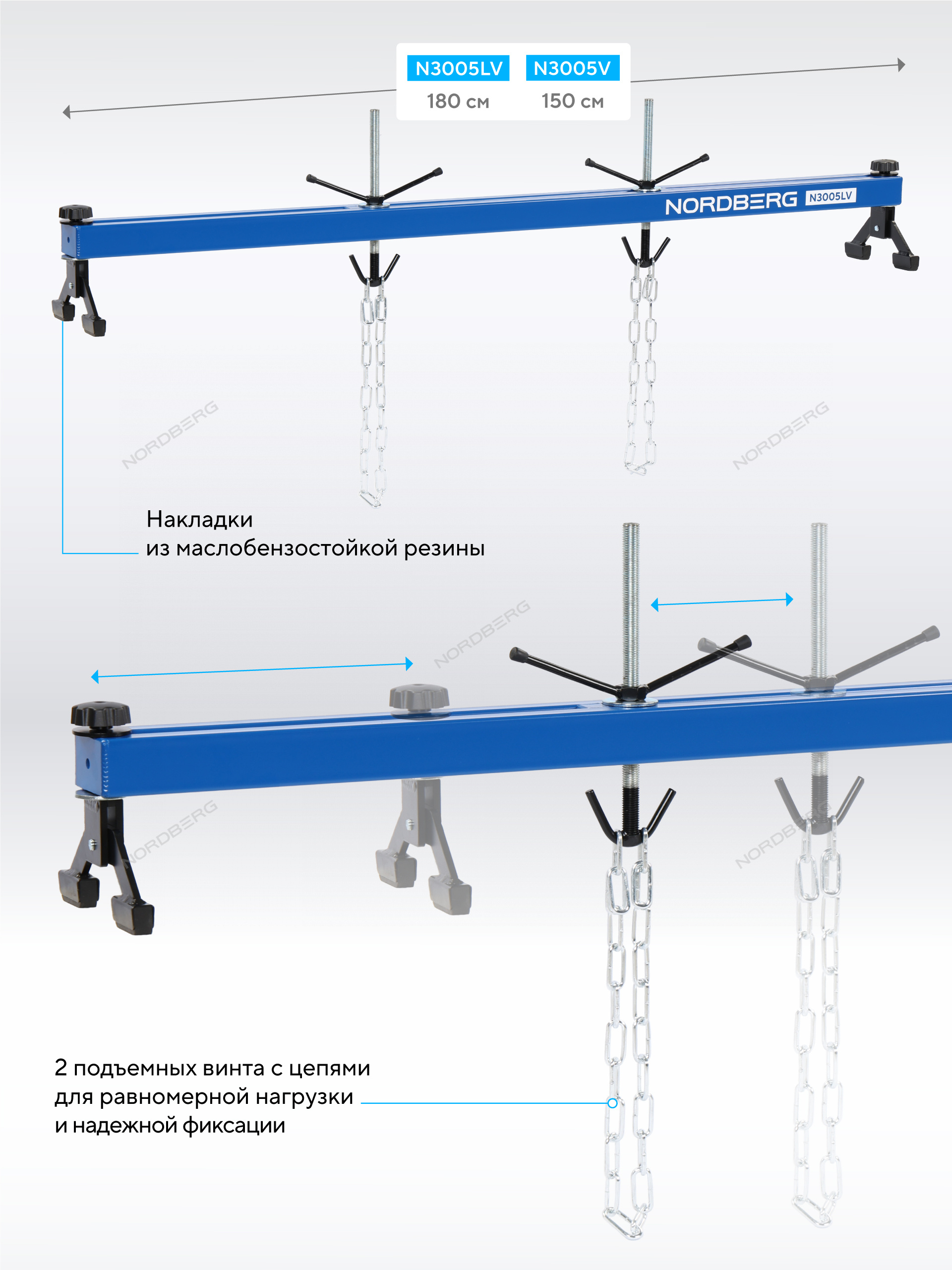 - Две V-образные опоры, надежно устанавливаются на крылья автомобиля, и два подъемных винта с цепями равномерно распределяют нагрузку и надежно фиксируют агрегат в моторном отсеке.