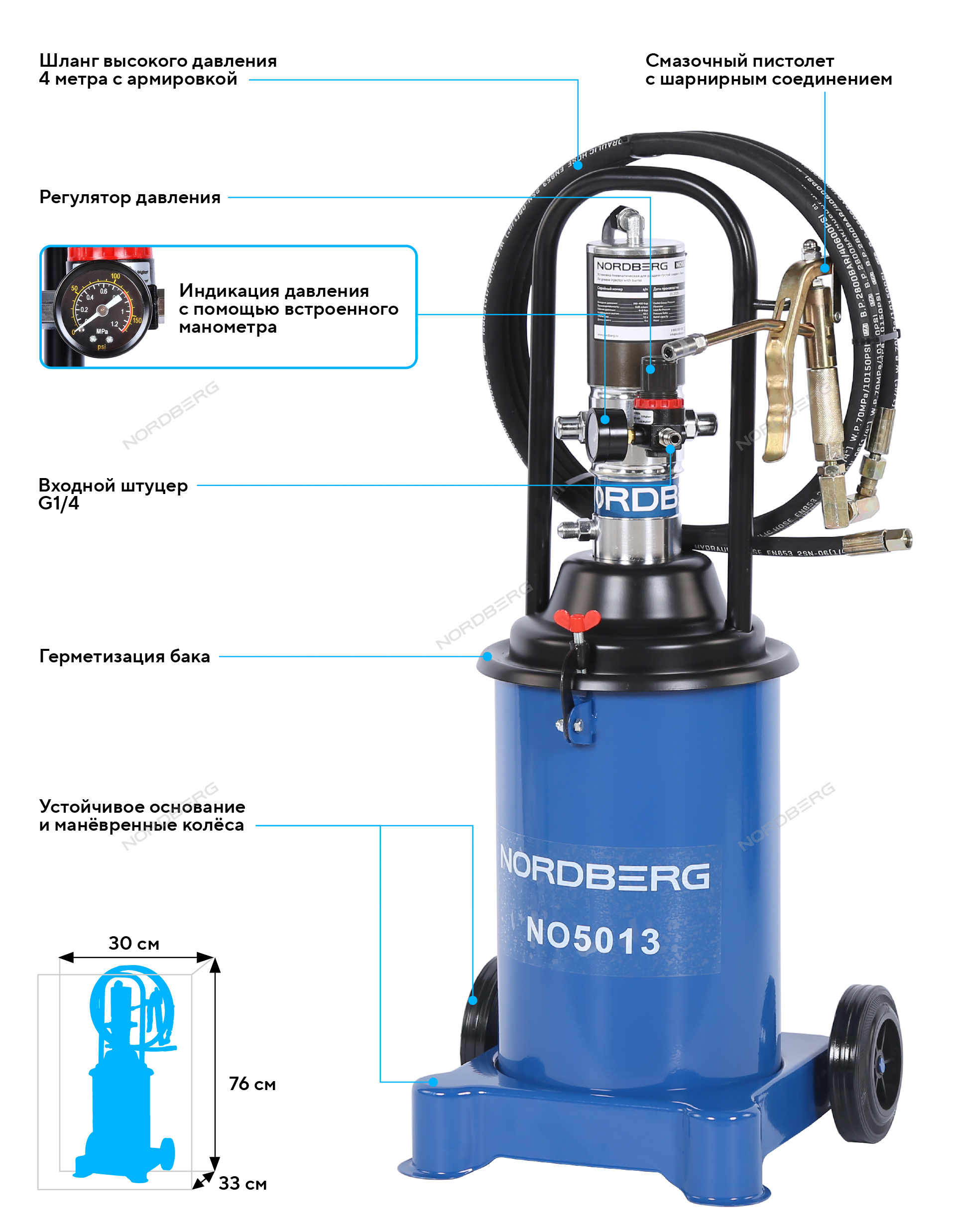 NORDBERG NO5013 — пневматическая установка для раздачи густой смазки с баком 12 л. Идеально подходит для автосервисов, мастерских и промышленных предприятий.
