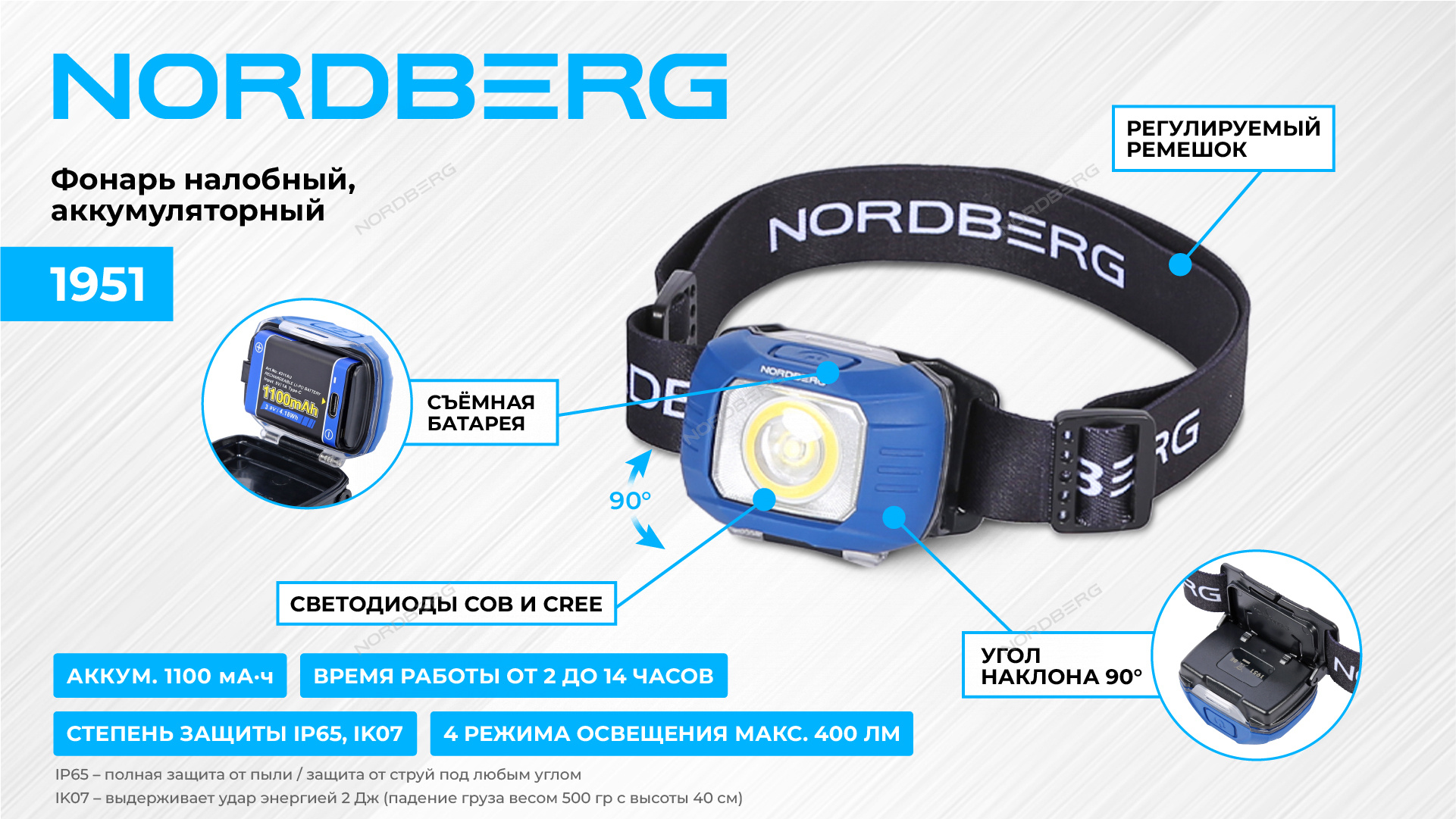 Светодиодный налобный аккумуляторный фонарь NORDBERG 1951 – удобный, энергоэффективный и долговечный инструмент при проведении ремонтных работ в автосервисах, СТО и в быту.