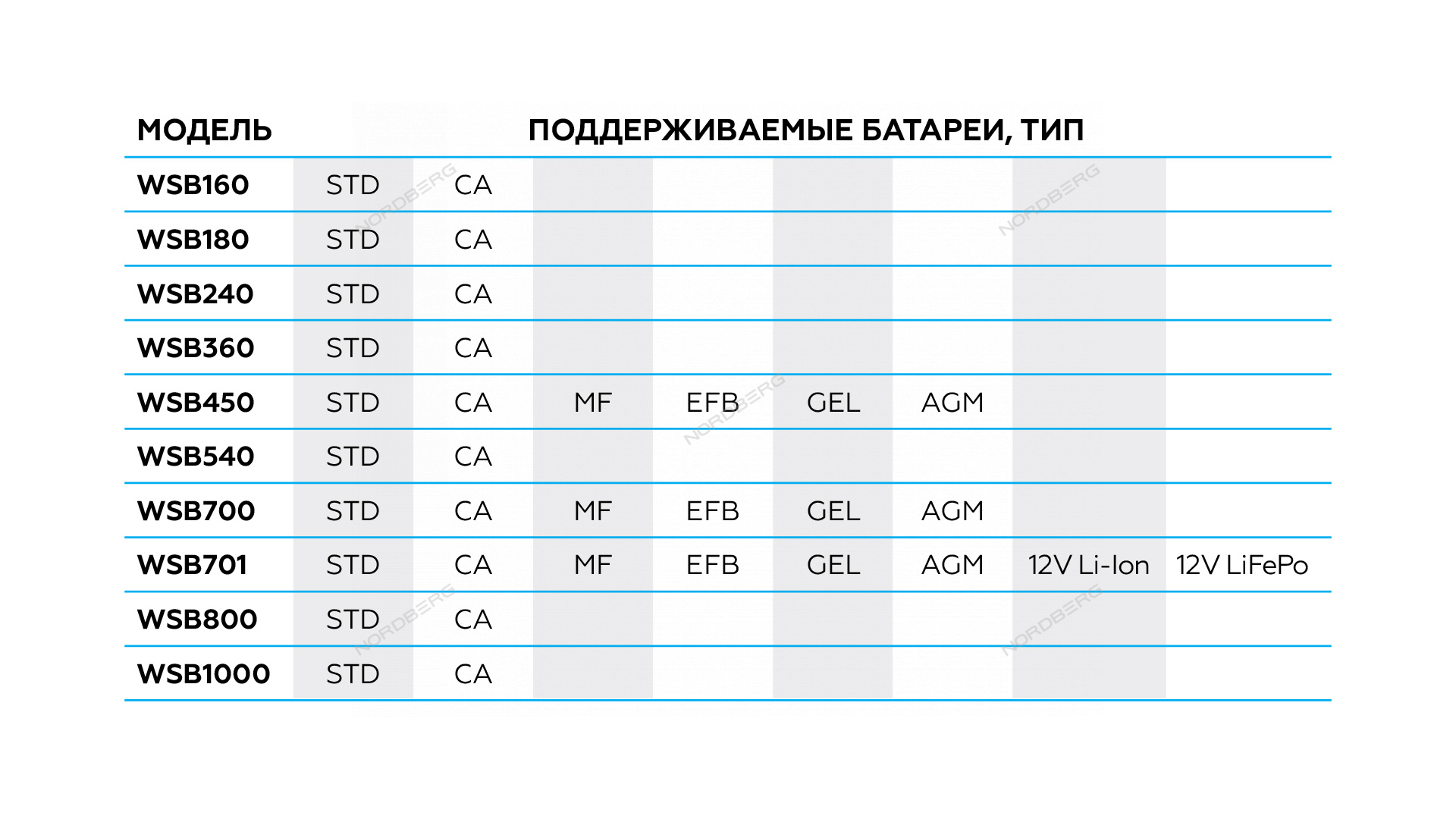 Автомобильное ПЗУ NORDBERG WSB701 позволяет эффективно произвести зарядку АКБ и запуск транспортных средств.