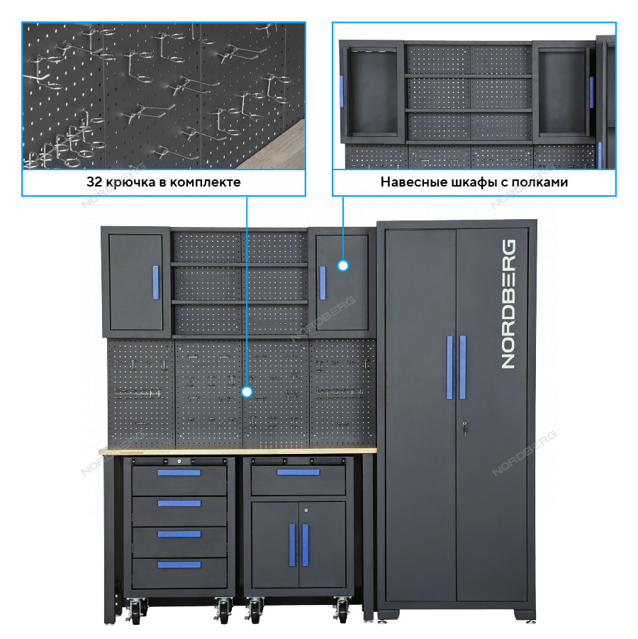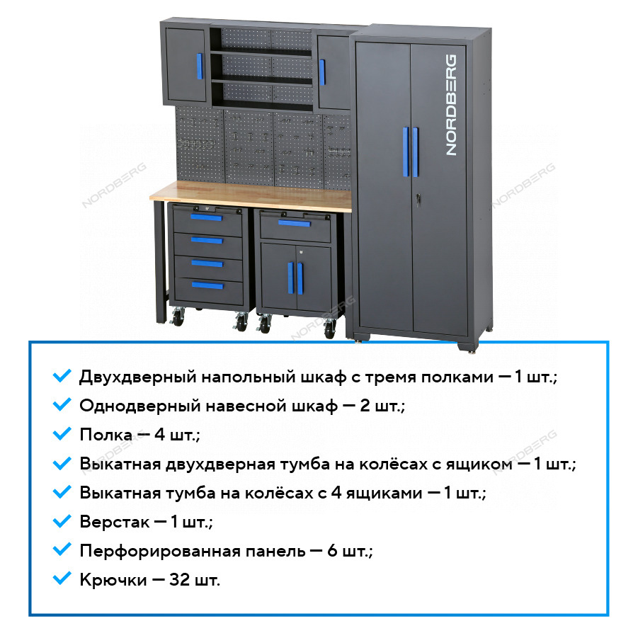 - Комплексное оснащение — в набор входит 8 элементов мебели, включая выкатные тумбы и перфорированные панели для подвесного хранения;