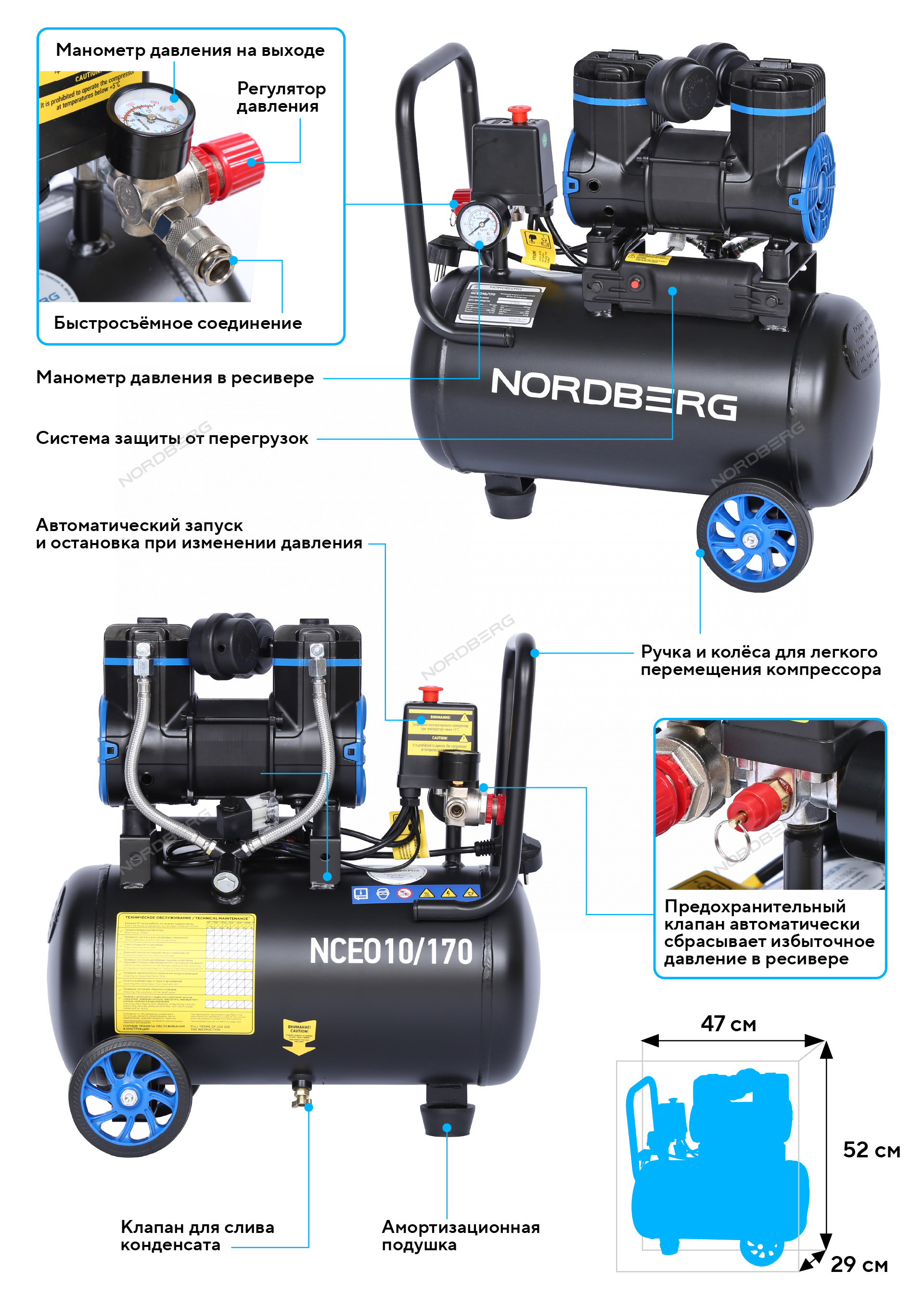 Компрессор безмасляный 220 В, ресивер 18 л, 170 л/мин Артикул: NCEO10/170
