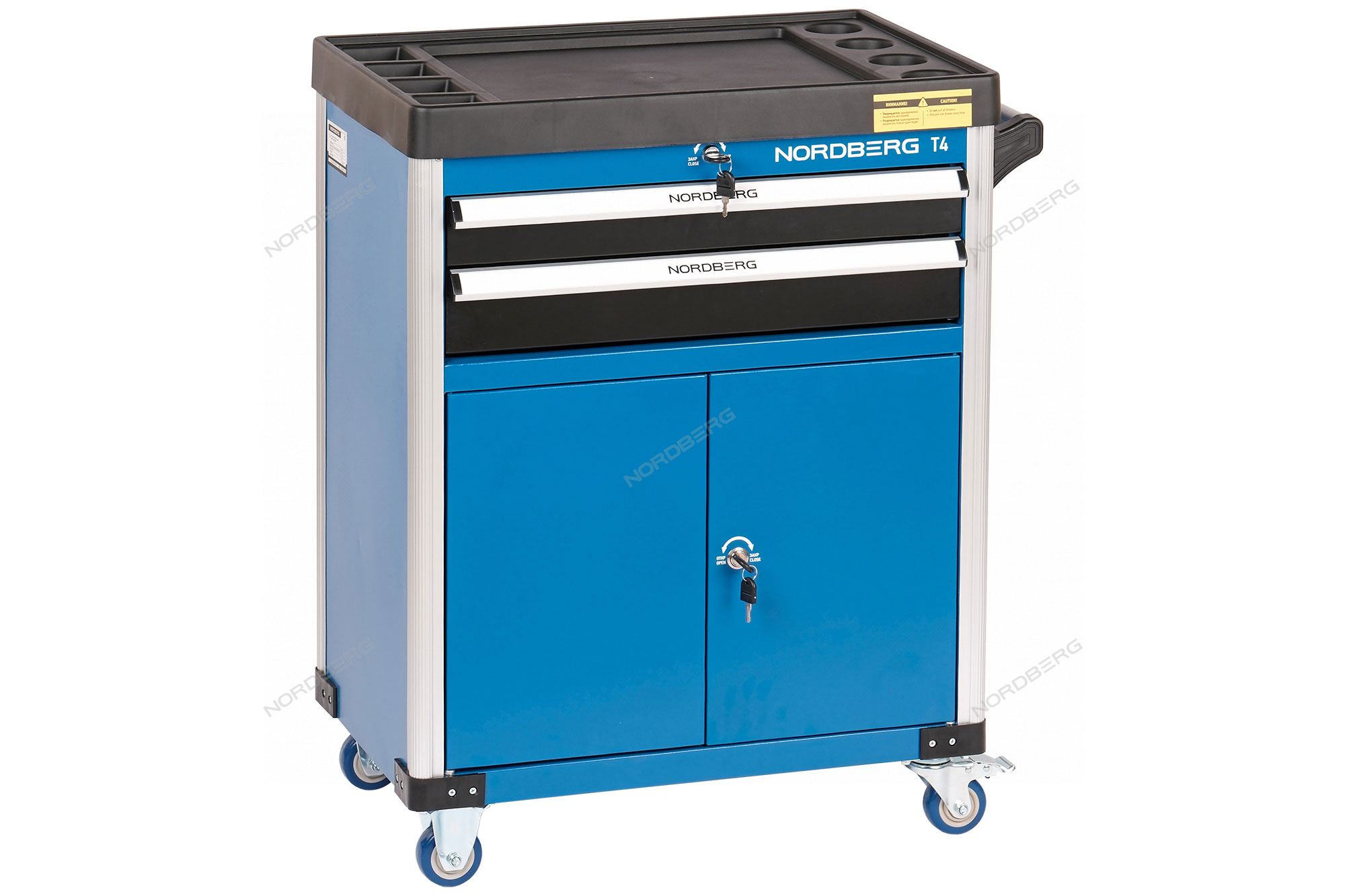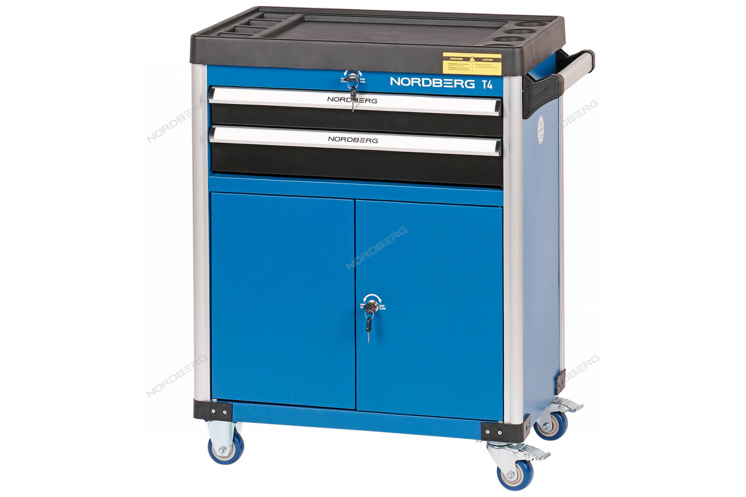 Тележка инструментальная NORDBERG T4 с 2 полками, 2 выдвижными ящиками, верхним пластиковым органайзером – для удобства работы и хранения инструмента в автосервисах, СТО и частных гаражах.