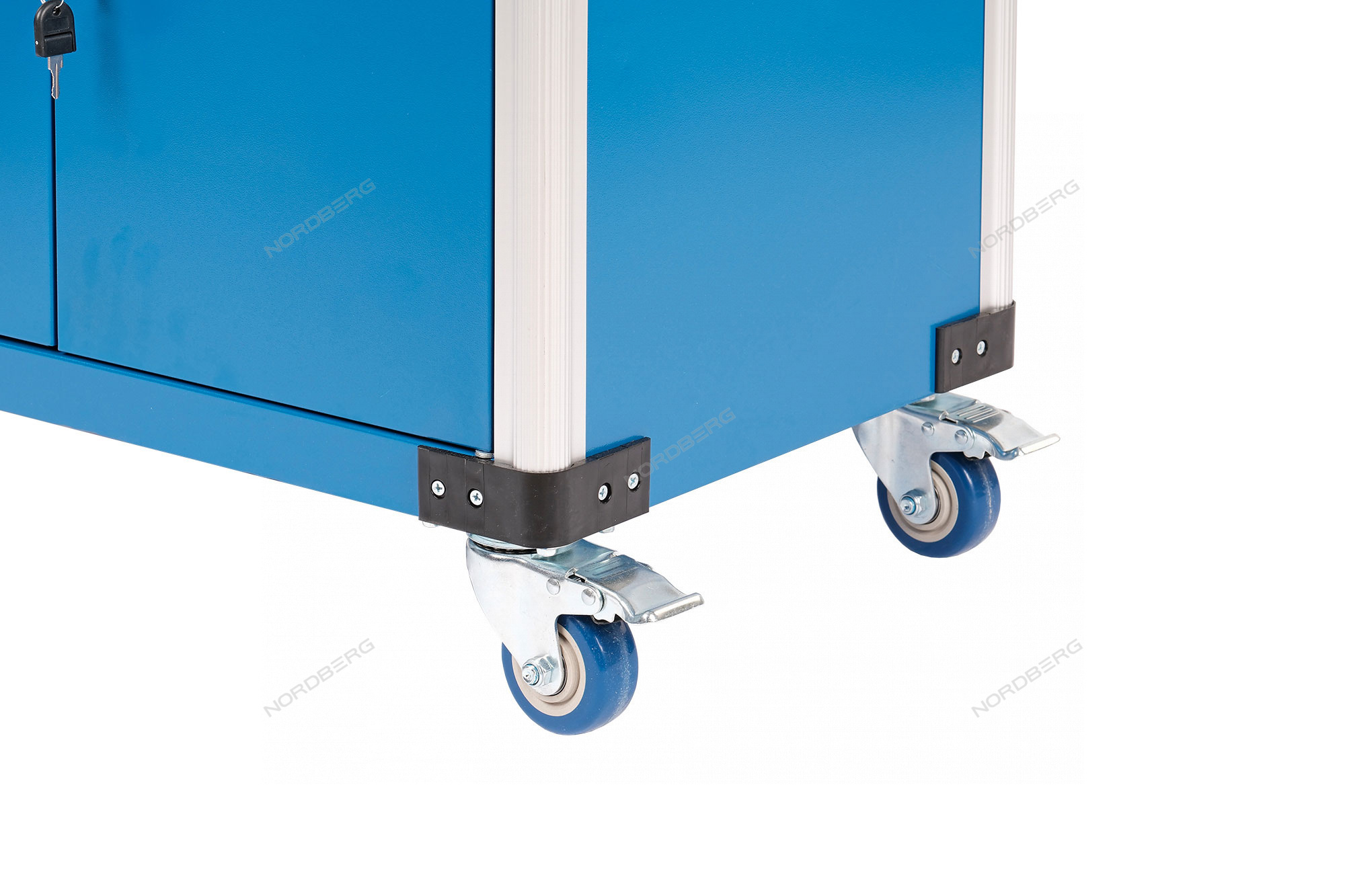 Рукоятка в верхней части и четыре поворотных колеса, два из которых со стопорами, обеспечивают легкое и простое перемещение тележки. Тележка организует порядок на рабочем месте, позволяя оптимально разместить необходимые инструменты