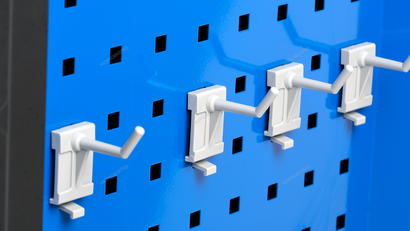 - Одна из боковых стенок тележки имеет перфорированную панель, для крепления на ней крючков для инструмента. Крючки идут в комплекте с тележкой.