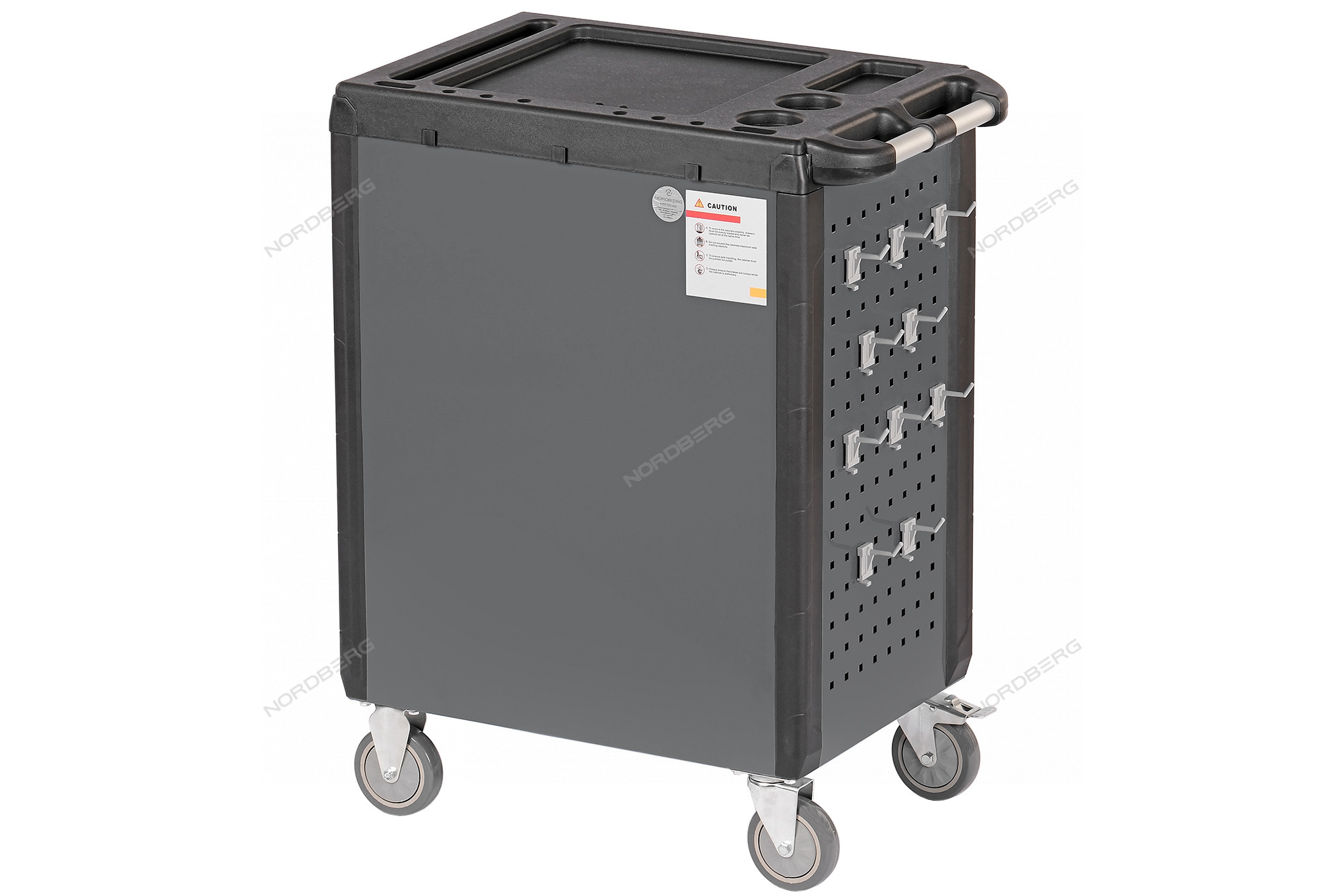 - Одна из боковых стенок тележки имеет перфорированную панель для крепления на ней крючков для инструмента. Крючки идут в комплекте с тележкой.