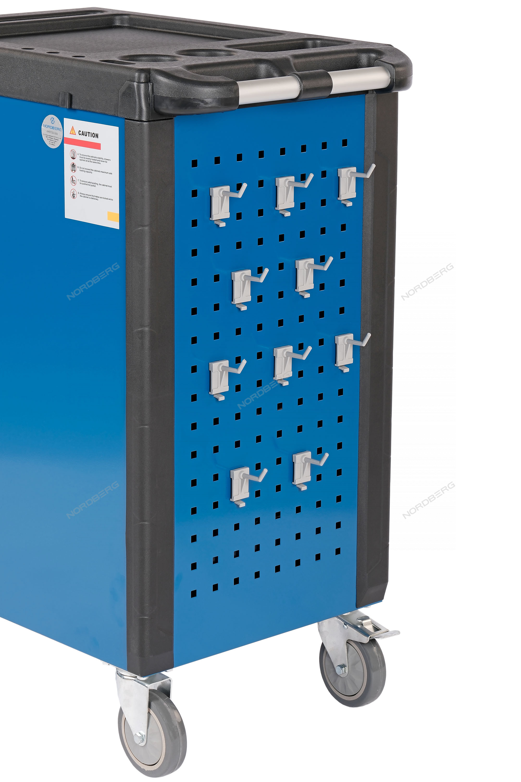 - Одна из боковых стенок тележки имеет перфорированную панель для крепления на ней крючков для инструмента. Крючки идут в комплекте с тележкой.