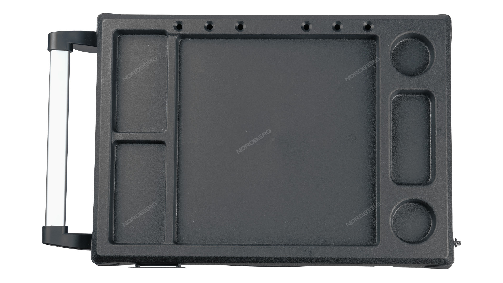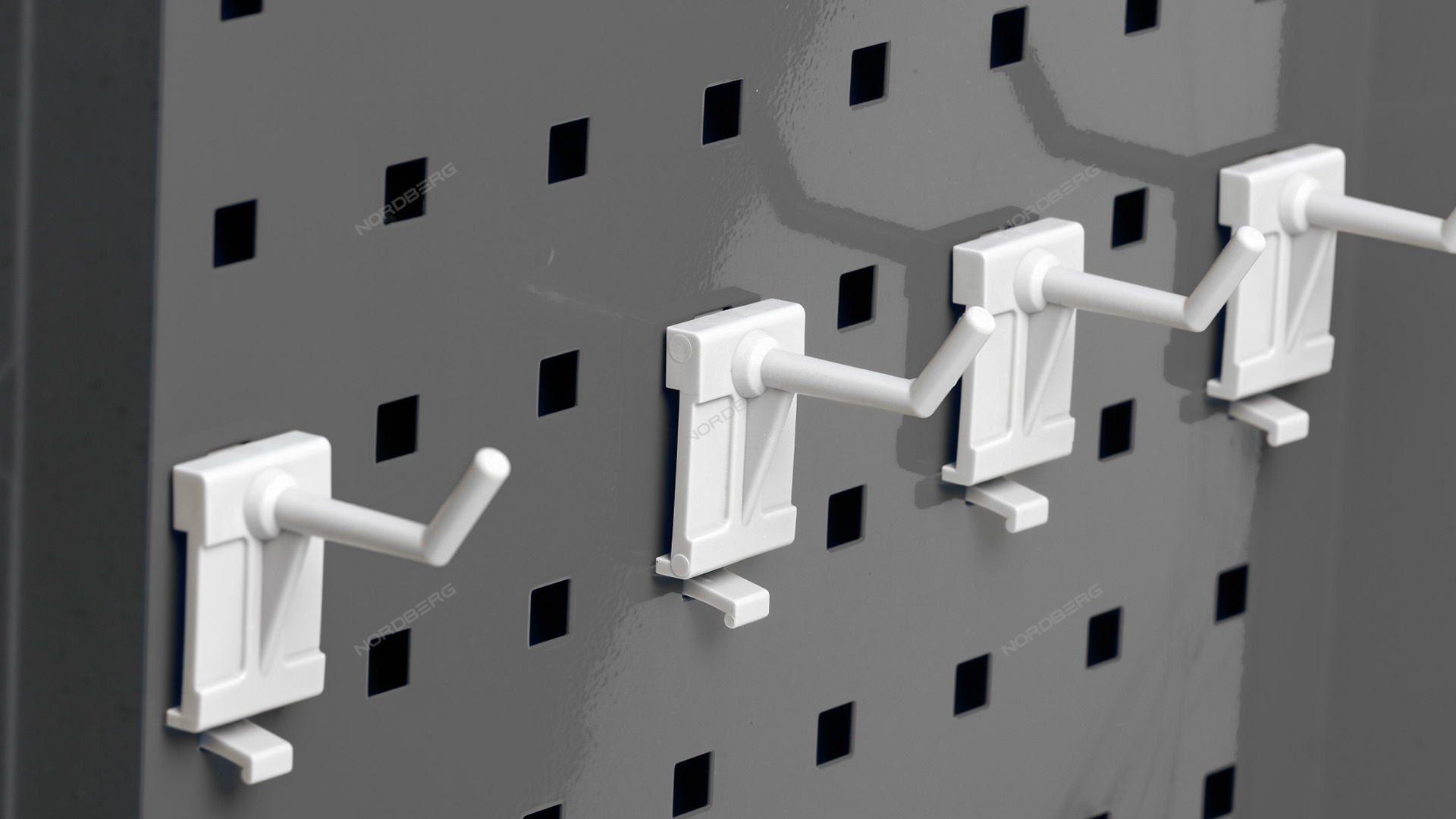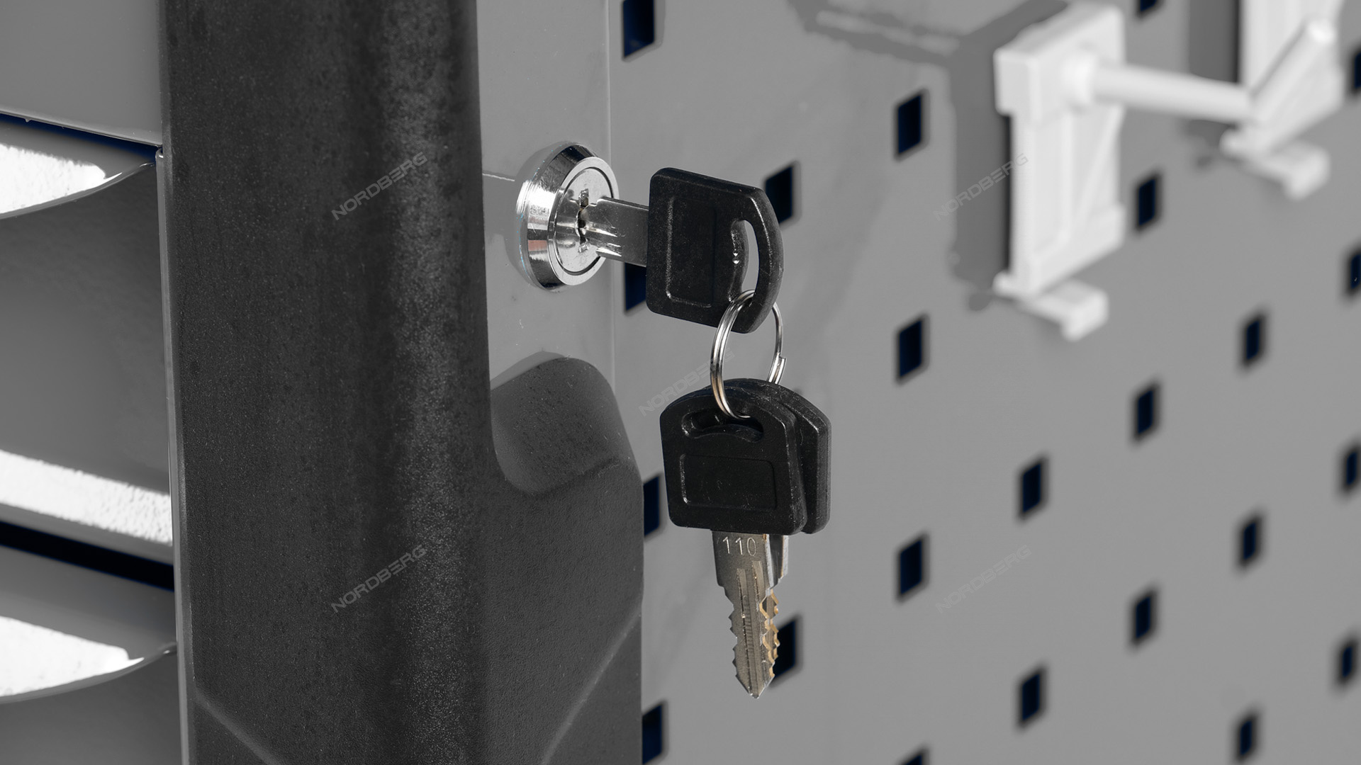 - Одна из боковых стенок тележки имеет перфорированную панель, для крепления на ней крючков для инструмента. Крючки идут в комплекте с тележкой.