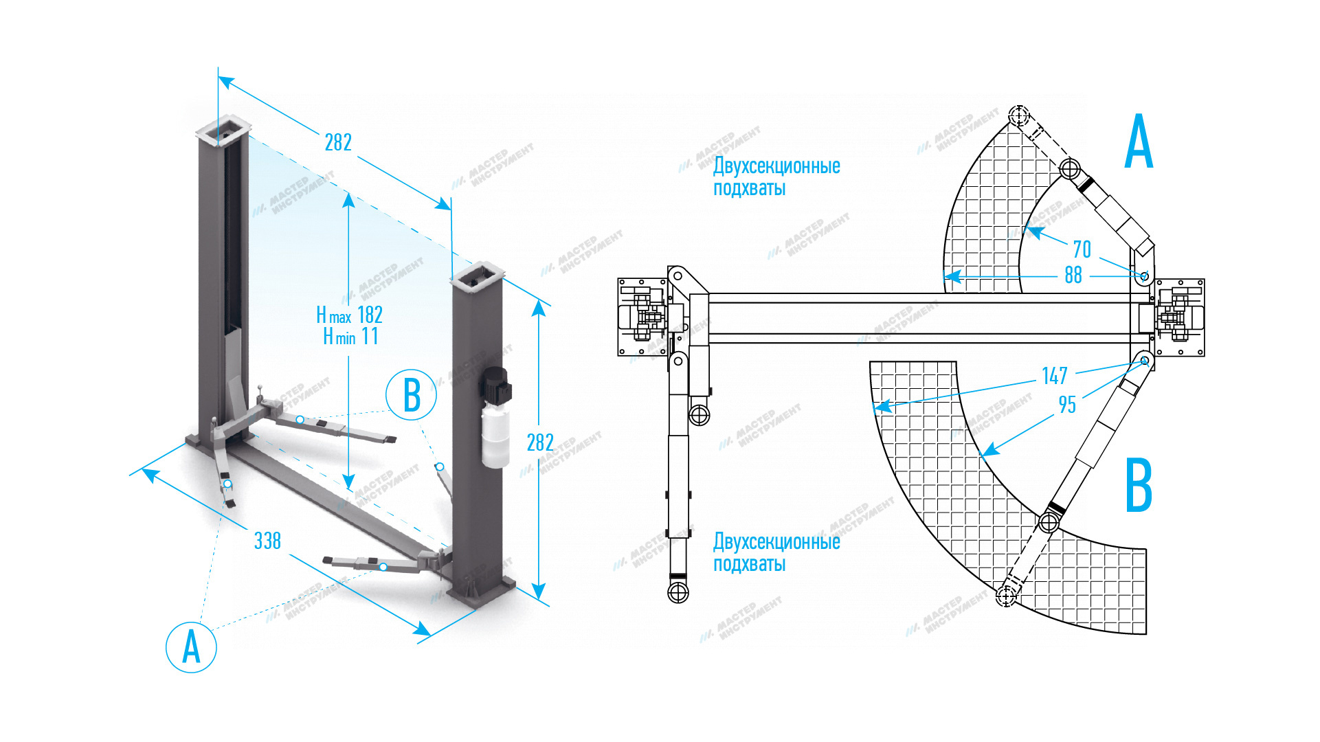Высота подхвата подъемника позволяет обслуживать автомобили с низким клиренсом.