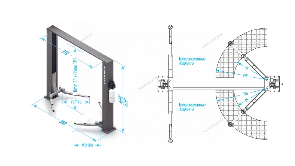 Подъемник двухстоечный 6 т Long, 380 В, серый NORDBERG N4122H1E-6G