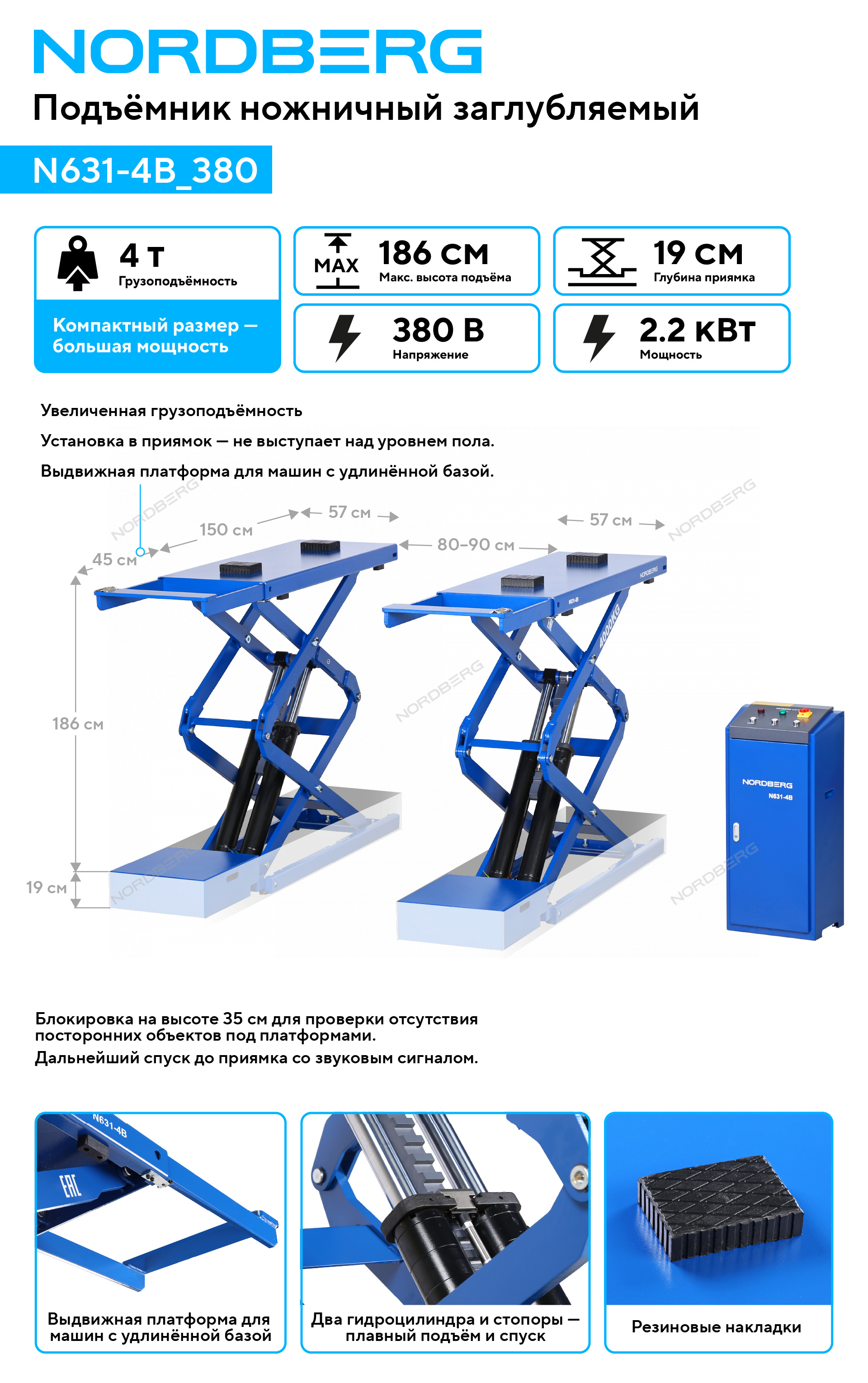 NORDBERG N631-4B_380 — электрогидравлический ножничный подъёмник, рассчитанный на подъём автомобилей массой до 4 тонн.