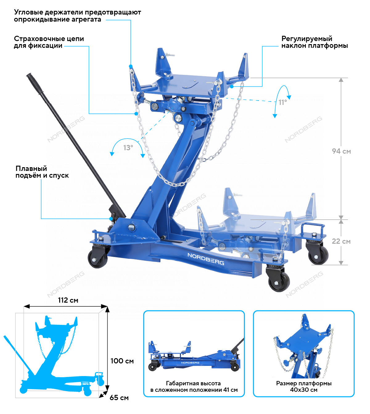 - Регулируемый наклон платформы: поперечный наклон 13°, продольный 11° — обеспечивает точное позиционирование трансмиссии перед установкой;