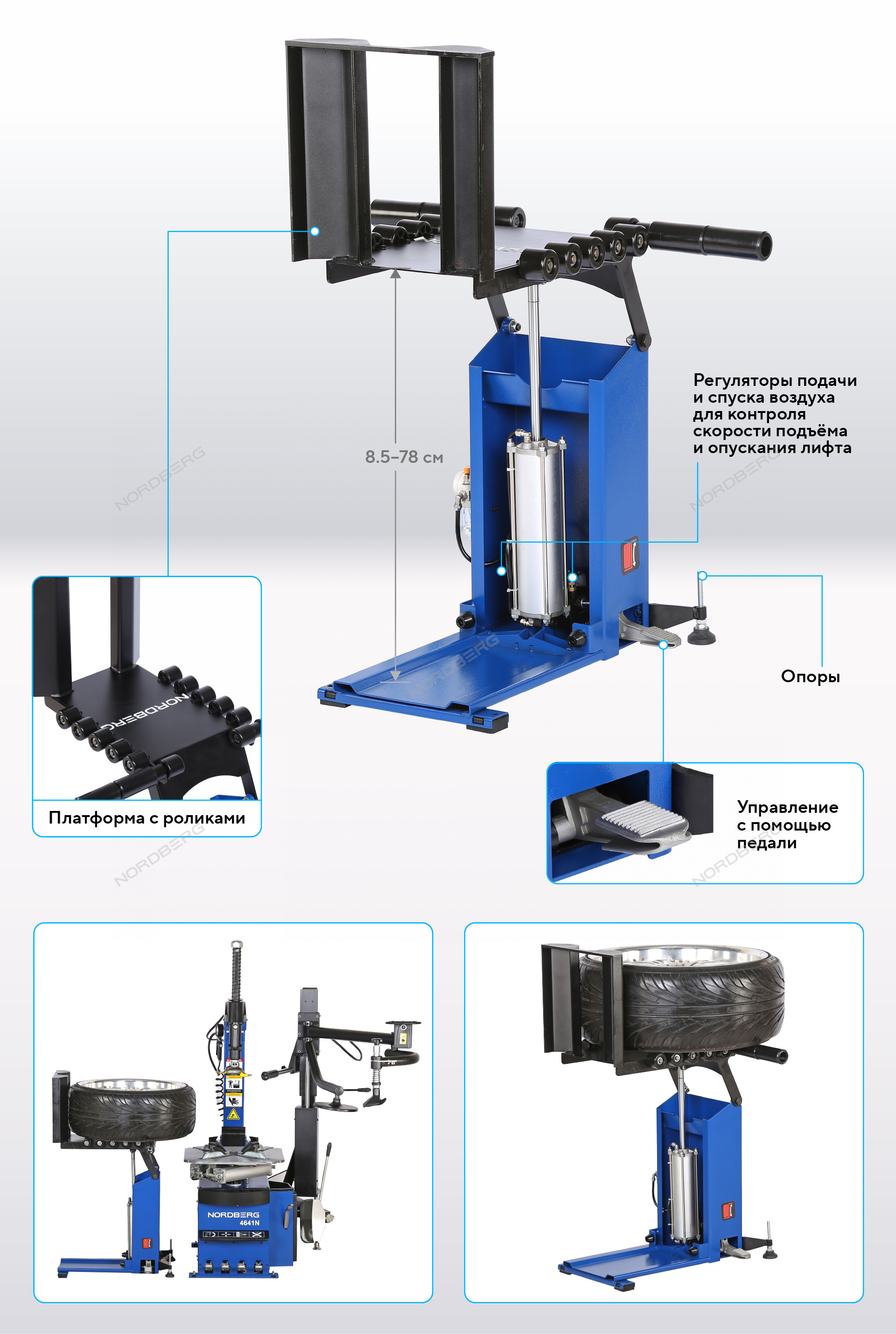 NORDBERG NTL21 — пневматический лифт для подъёма колёс. Применяется в автосервисах и шиномонтажных мастерских для облегчения монтажа и демонтажа шин.