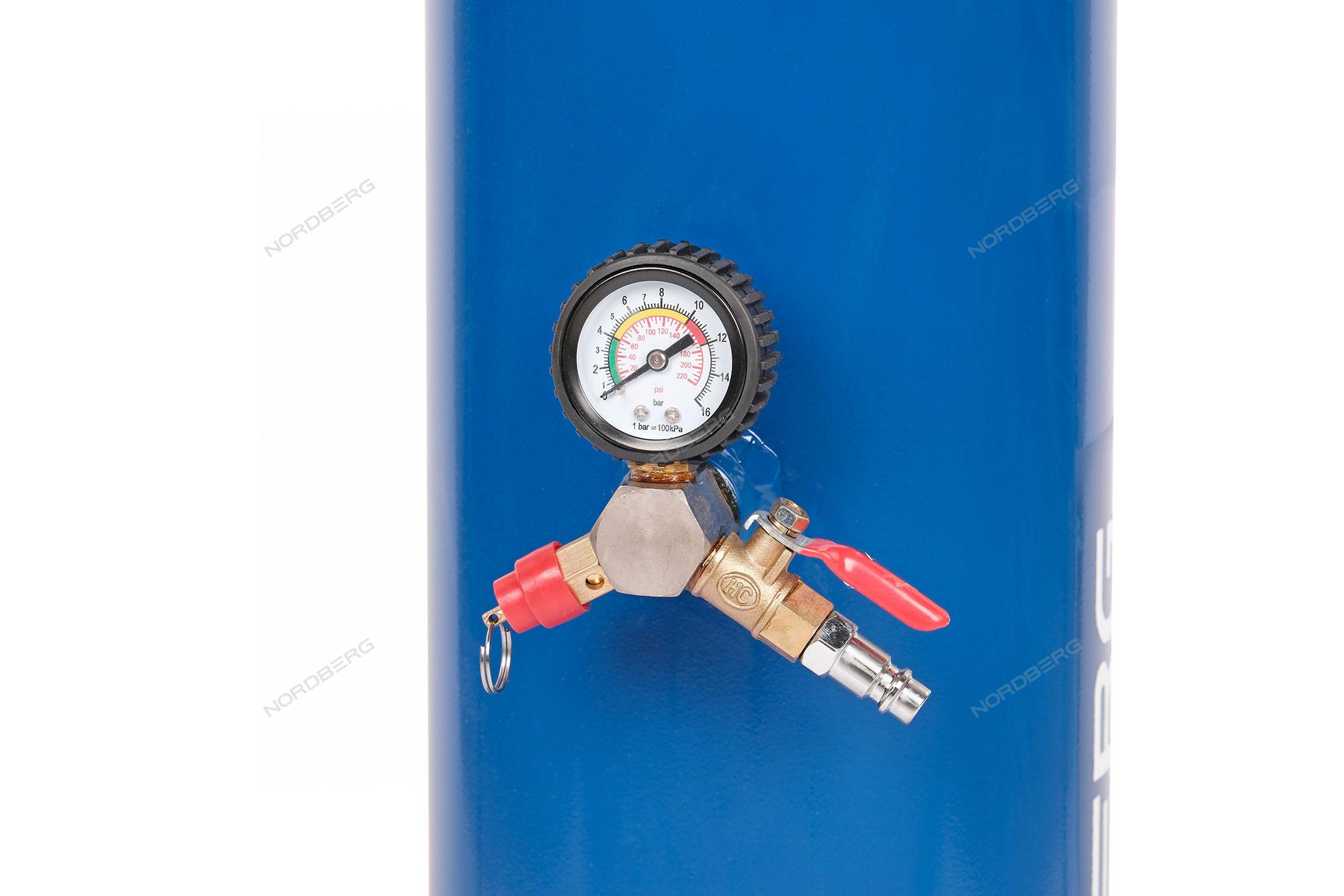 - Вертикальное расположение алюминиевого ресивера, а также верхняя стальная ручка делают перемещение и хранение бустера удобным.
